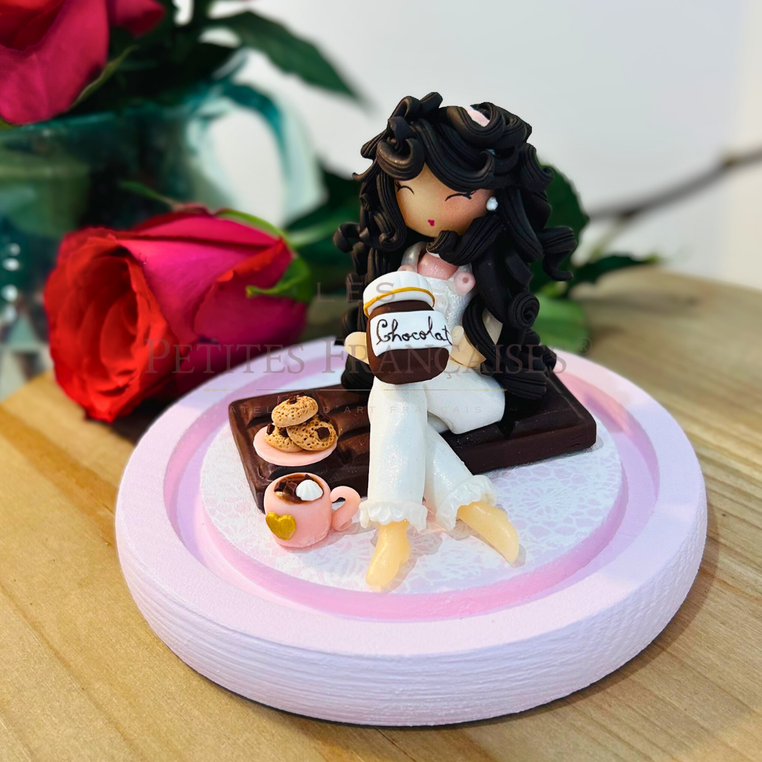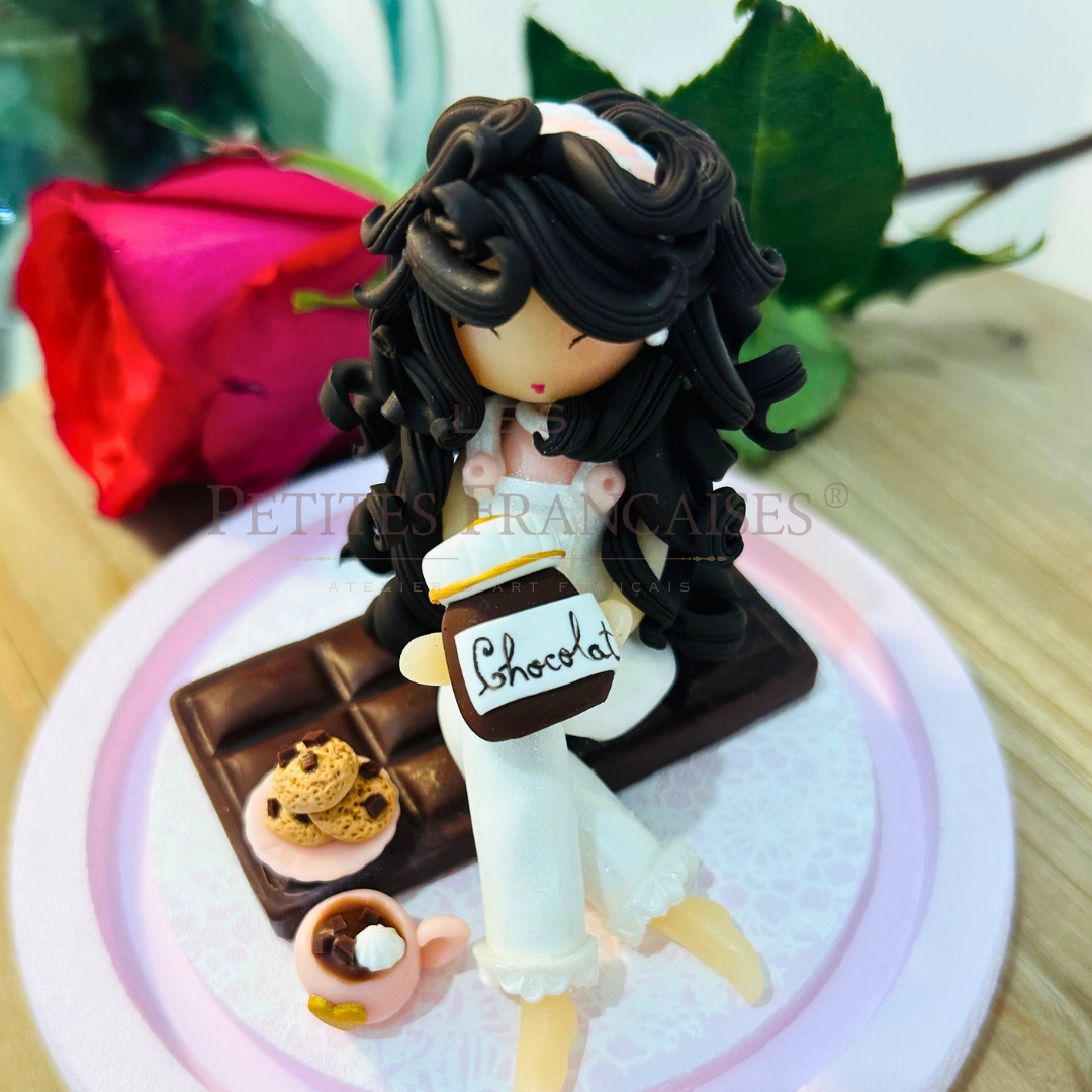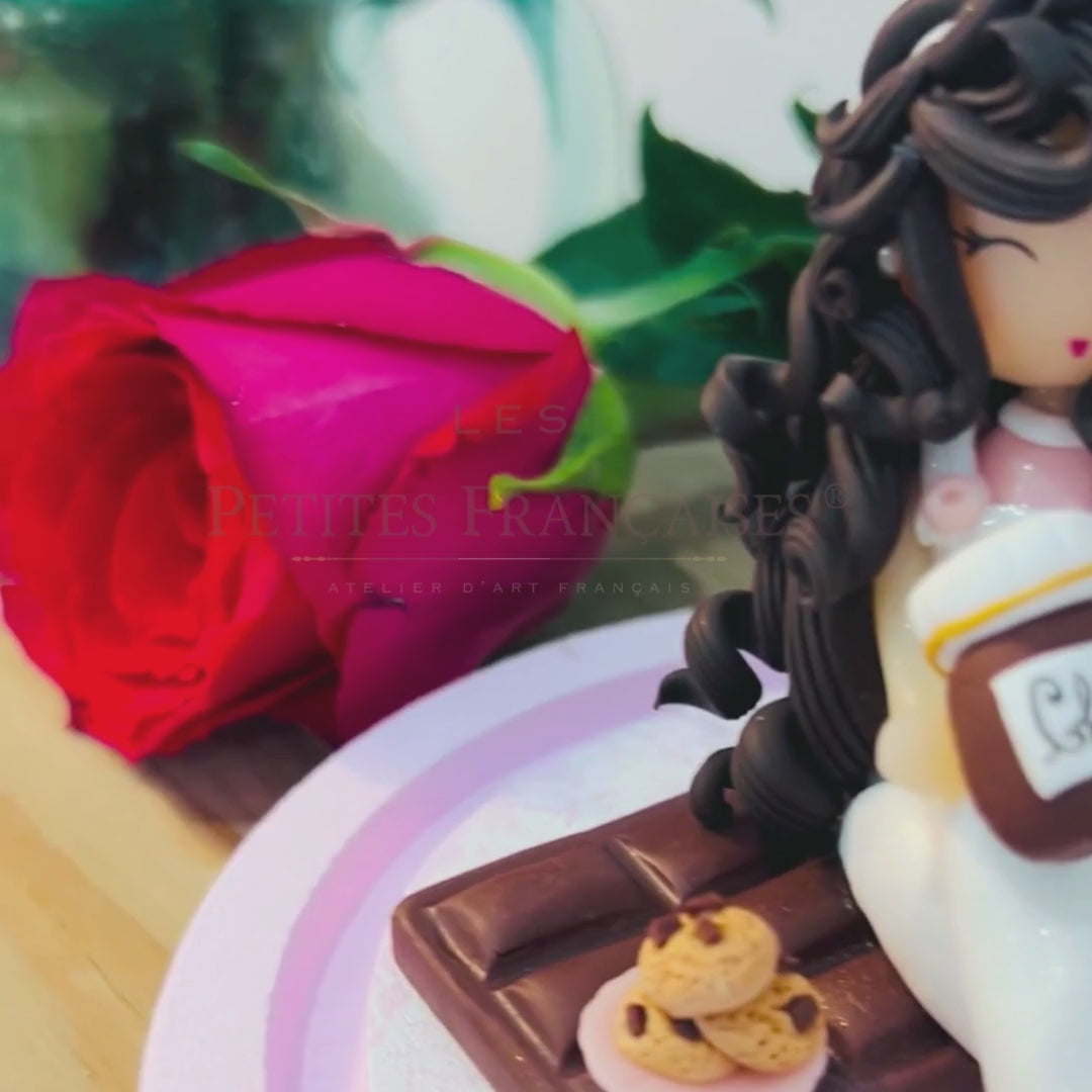 La scène est composée de détails délicats aux teintes chocolatées et rose (tenue, accessoires gourmands), le tout présenté sur un joli socle harmonieusement assorti.