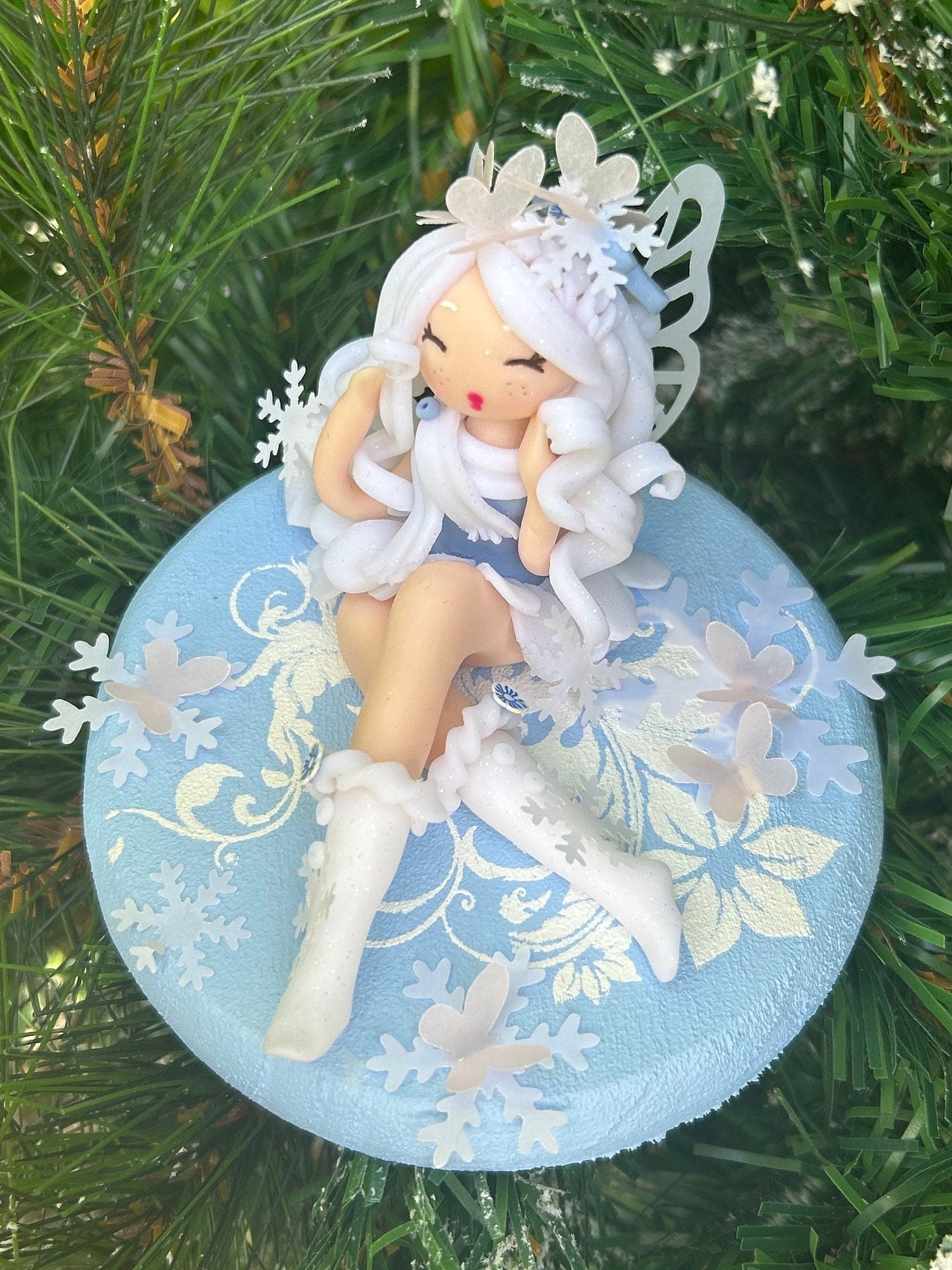 Avec ses ailes blanches, ses papillons de glace et ses petits flocons sculptés, elle évoque la magie silencieuse de l’hiver. Posée sur un socle en bois peint à la main, elle apporte une touche lumineuse et féerique à votre décoration, à poser près d’une bougie ou sur un rebord de fenêtre.