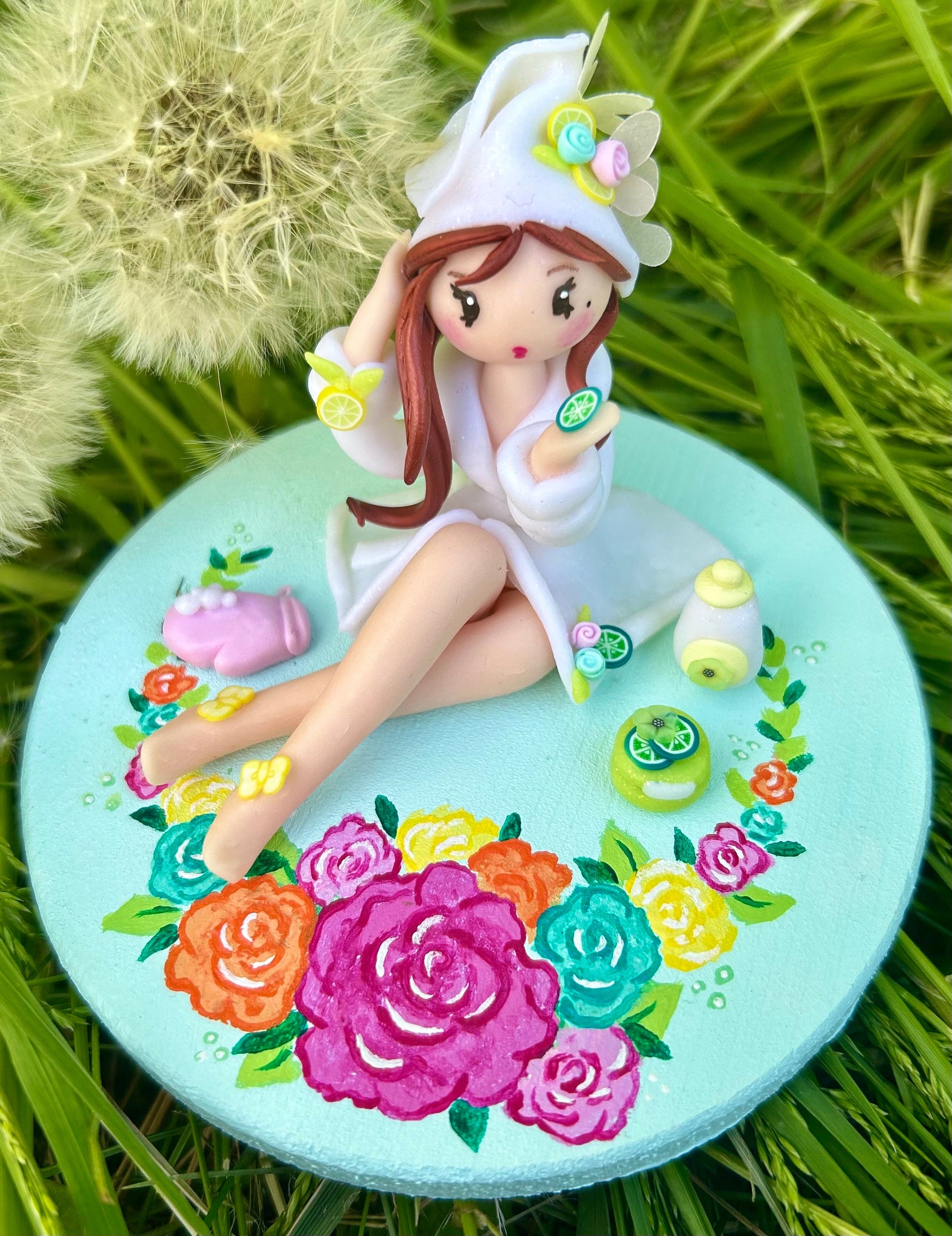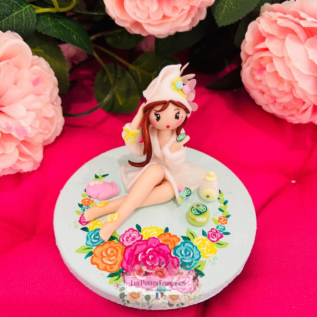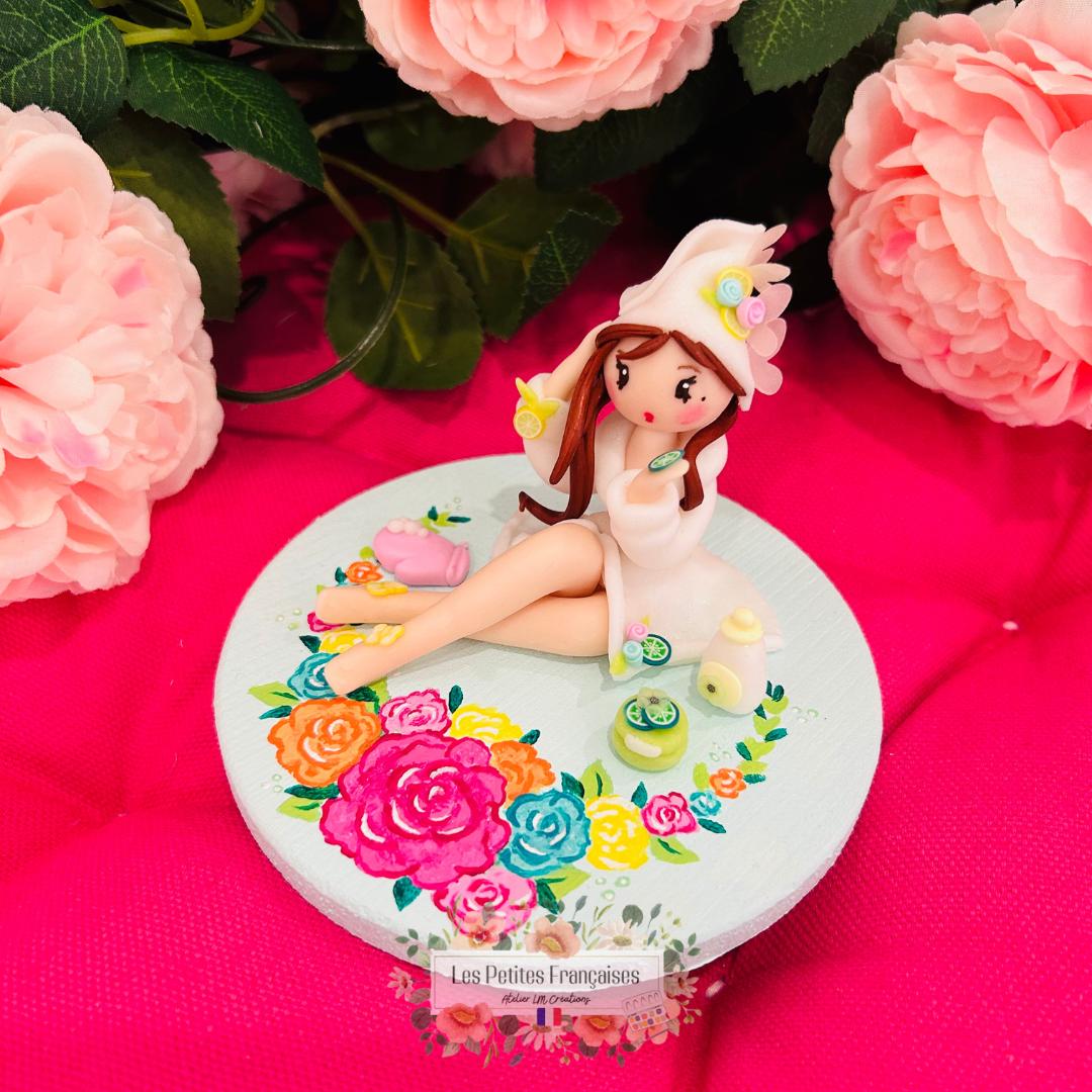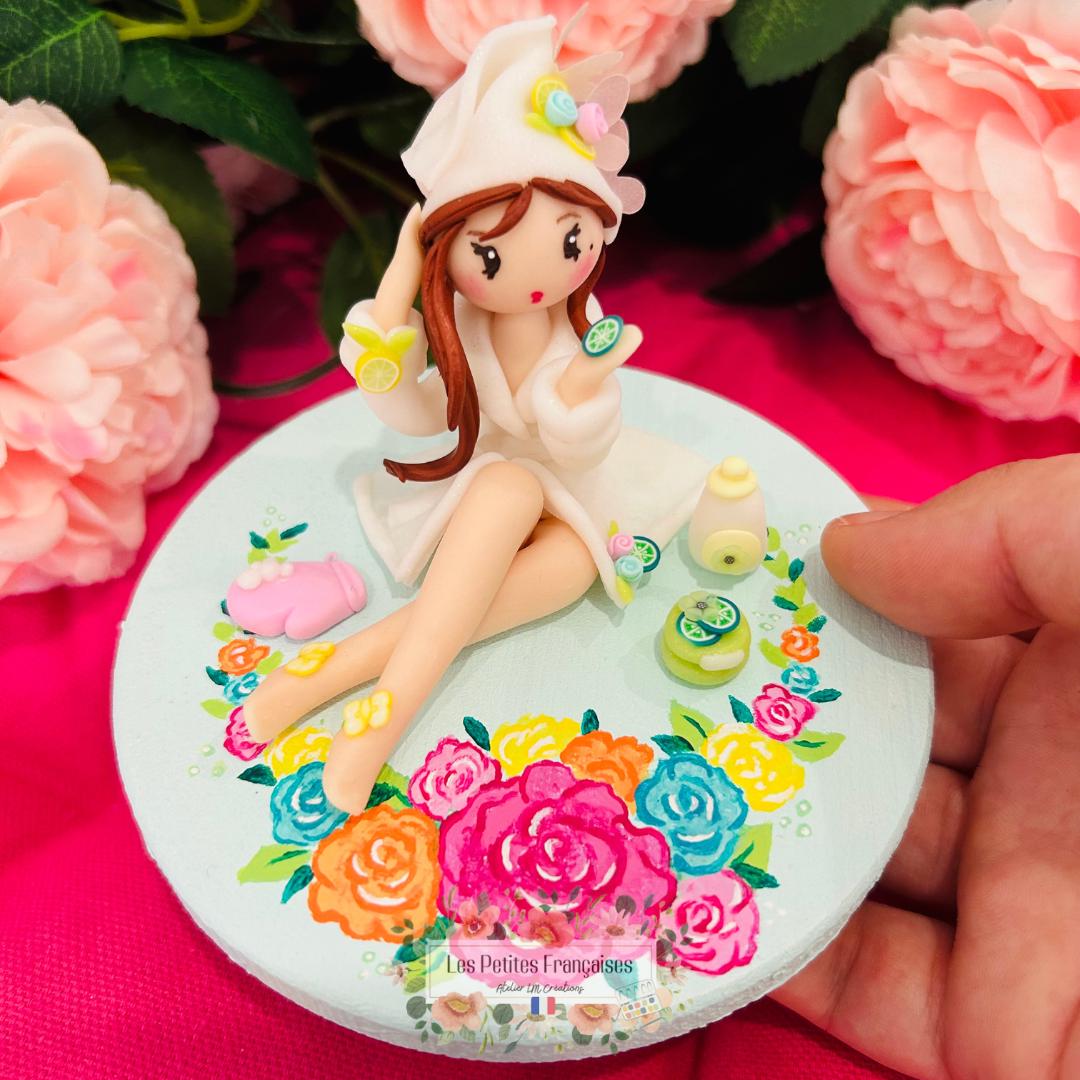 Elina capture un instant de soin et de douceur dans une scène miniature tout en élégance. Une parenthèse de bien-être, posée sur un socle en bois peint à la main, comme une bulle de calme à déposer dans votre intérieur.